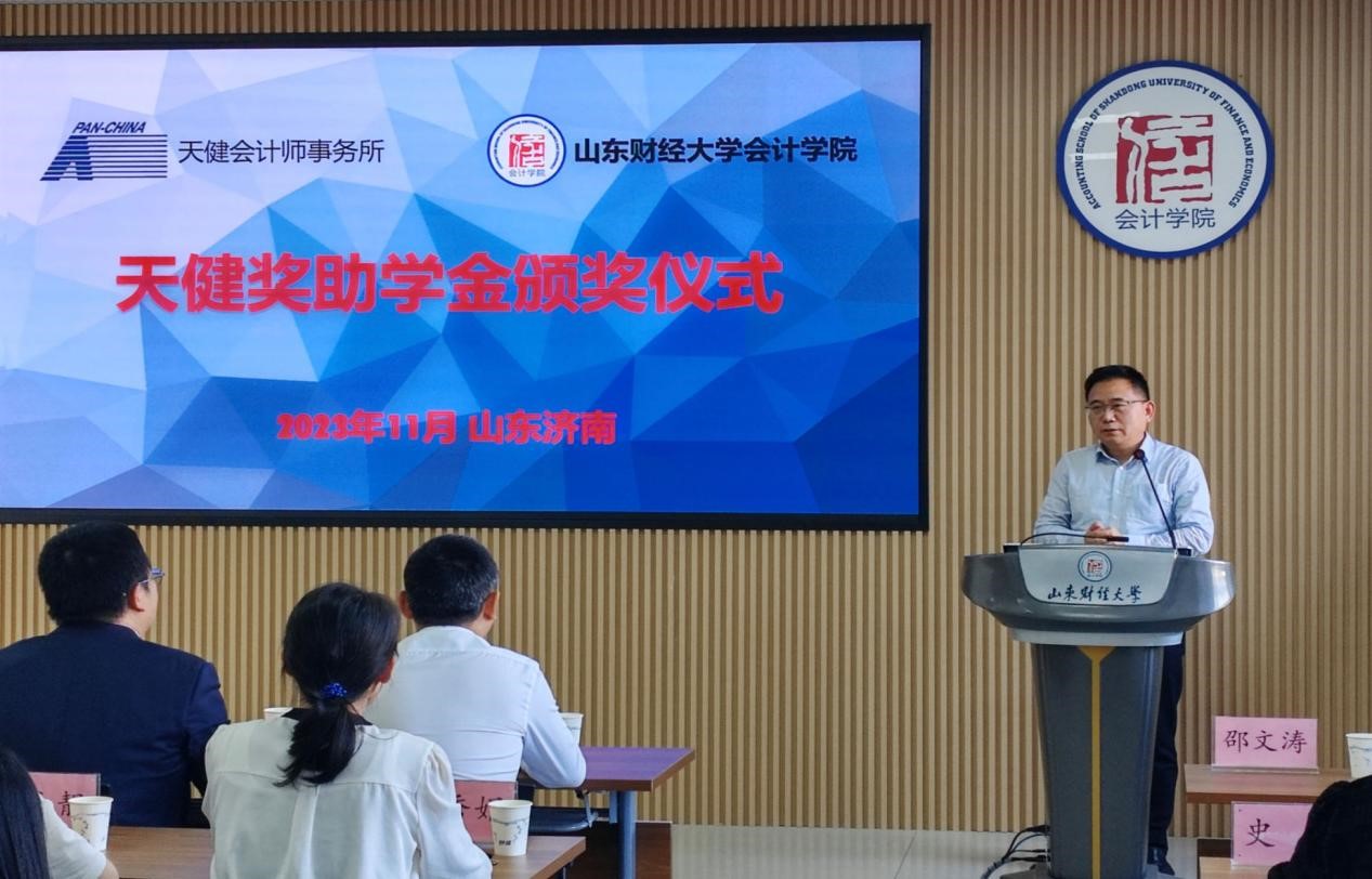邵文涛在致辞中首先对天健会计师事务所的到来表示热烈的欢迎。邵文涛表示,天健会计师事务所在业界有着雄厚的实力和高尚的情怀,对天健会计师事务所积极承担社会责任,密切关注高等教育,热心培养行业人才表示衷心感谢,希望双方进一步携手共进、加强合作,共推会计事业的发展。最后,邵文涛对获奖同学表示了祝贺,并提出新的期望,希望他们再接再厉,积极投身会计事业。
