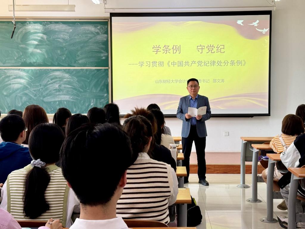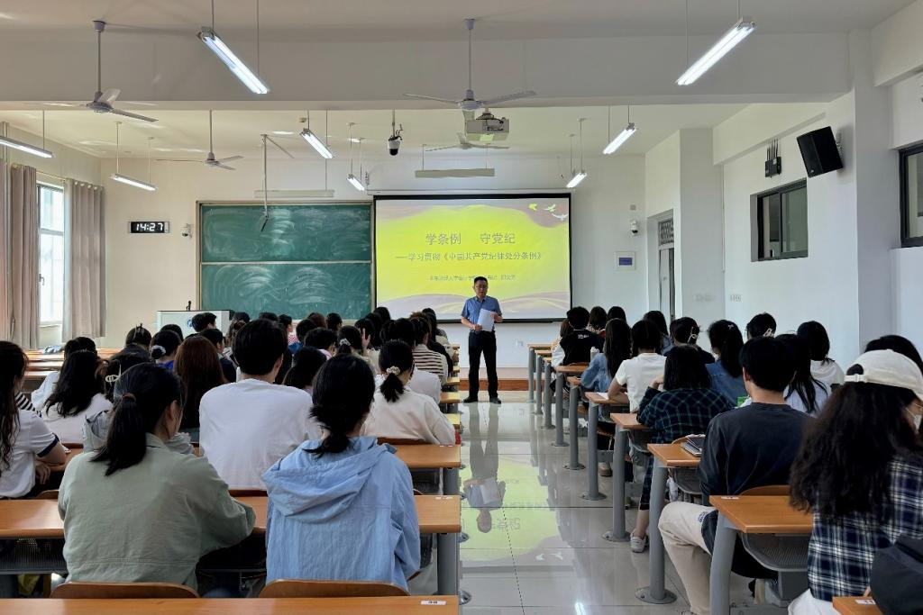 为深入学习贯彻习近平总书记关于党纪学习教育的重要讲话、重要指示精神,学习贯彻党中央决策部署和省委工作要求,不断增强学生党员的责任感、使命感和担当意识,4月25日下午,永利yl23411集团党委书记邵文涛在圣井校区为学生党员讲授“学条例 守党纪”——党纪学习教育专题党课。学院党委副书记钟毓卓,党委组织员、学生第二党支部书记张沫以及圣井校区学生党员参加。