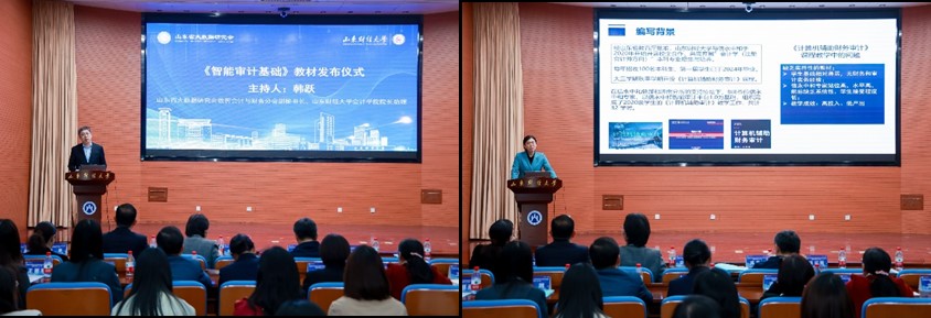 随后举行了《智能审计基础》教材发布仪式,由山东省大数据研究会数智会计与财务分会副秘书长、永利yl23411集团院长助理韩跃主持,山东省财经大学审计研究中心副主任牛艳芳教授介绍了教材的编写背景以及教学目标等内容。