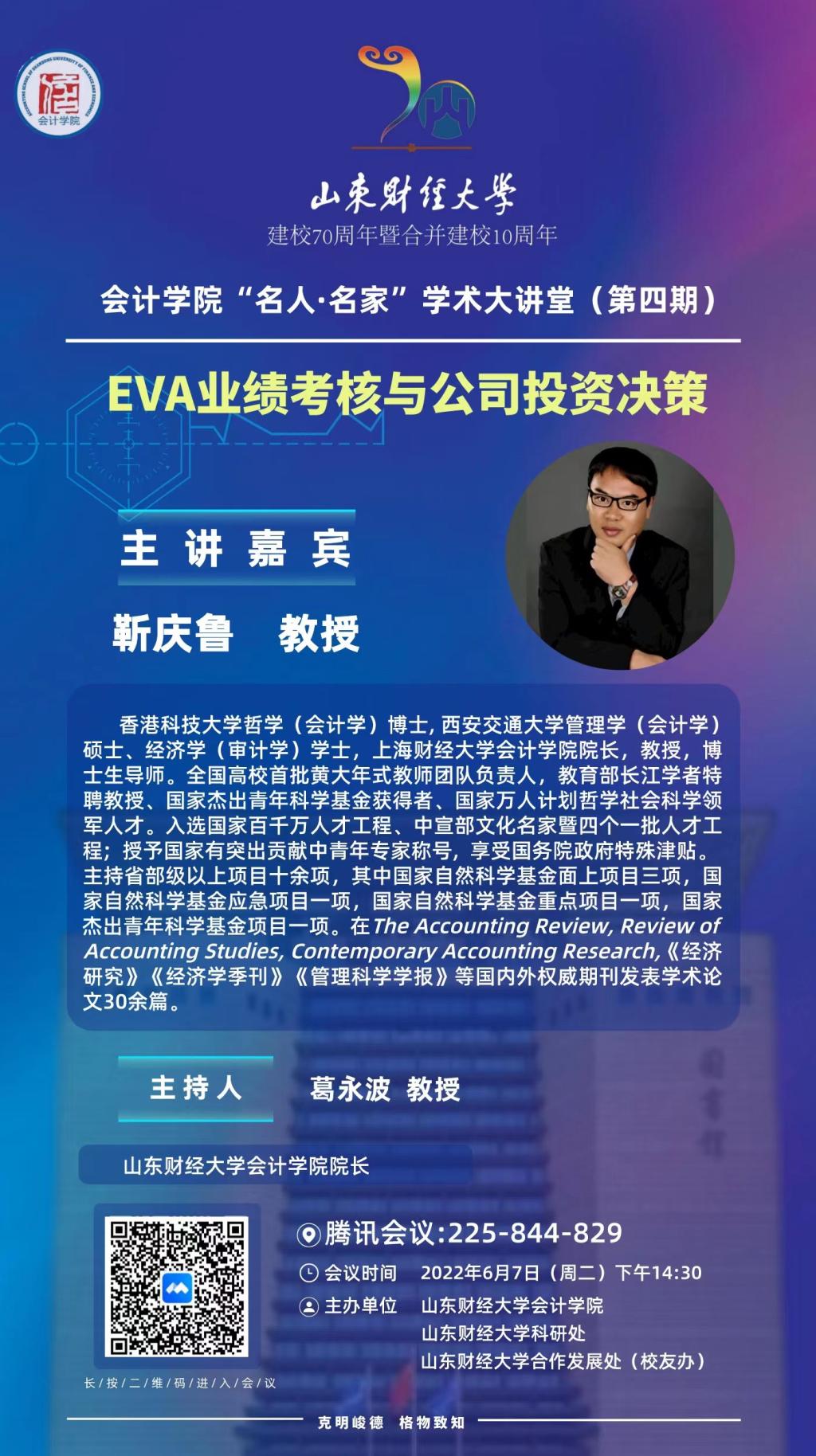 第四期“名人·名家”学术大讲堂将由上海财经大学永利yl23411集团院长靳庆鲁主讲,主题为:EVA业绩考核与公司投资决策。