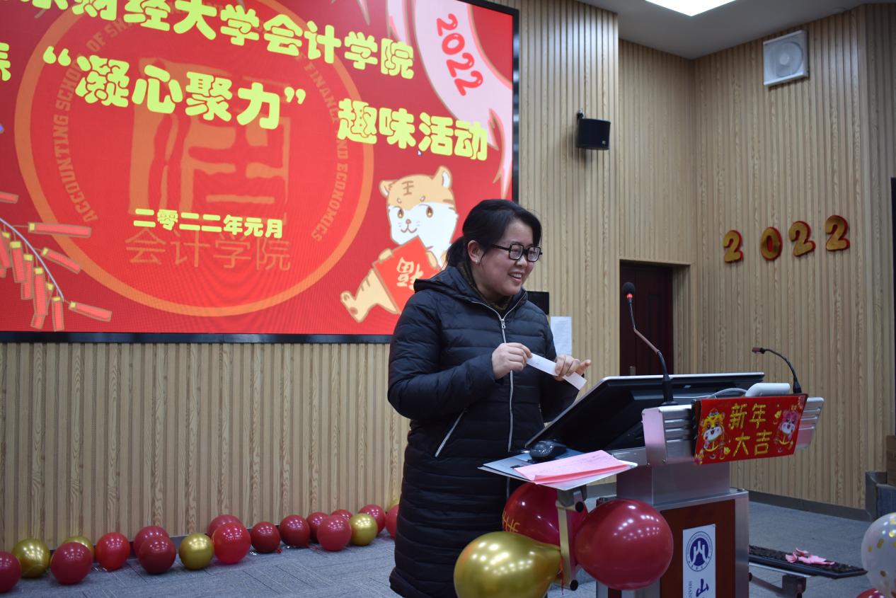 趣味活动在热烈氛围中开启,由辅导员张沫主持。以幸运抽答题的方式,在主持人幽默风趣的引导下,老师们热情踊跃参与。有的老师分享2021年最开心、最有意义或最遗憾的事,也有老师告白2022新年的第一个期待、立下第一个flag。大家感慨岁月片刻不曾停歇,艰难中有幸福,平淡中有惊喜;感叹经历感悟不同却有同样的感受。活动中还抽取了20位幸运老师并送出学院精心准备的新年礼物,现场欢声笑语,掌声不断。