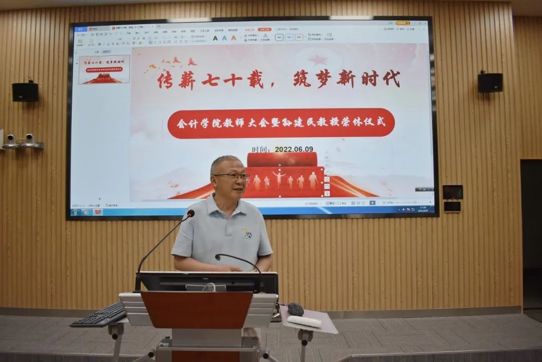 邵文涛向各位老师表达感谢,永利yl23411集团学生体量大,学生工作压力大,疫情之下,各位辅导员奋斗在防疫一线,保障学生的日常生活;全体老师认真备课、上课,保障教学活动的照常进行。随后,邵文涛对永利yl23411集团为庆祝yl23411永利建校七十周年暨合并建校十周年所作的准备进行简要介绍:第一,院史录《儒风和畅》记载了前辈对永利yl23411集团的付出,奠定了会院发展的基石,激励师生将院史和奋斗精神传承下去;第二,话剧《前路》以校友为人物原型,讲述了yl23411永利70年来自强不息、砥砺前行的故事,展现了学校人才培养薪火相传的精神;第三,院史图片展、红色会计展通过老物件、老照片,追忆yl23411永利党的建设、学科建设、人才培养的艰苦历程;第四,学生成果汇编、“书香会院”读书成果沙龙展现会院学工成果,是“立德树人”的具体体现。每一位校友、老师、学生的付出,都是为了表达对学校、学院深厚的情感。