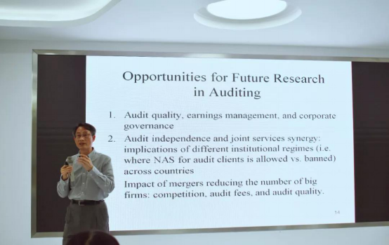 随后,张教授讲解了关于未来管理会计和审计的一些研究方向。在管理会计领域可能有如下研究方向:客户盈利能力分析是否影响客户关系管理实践、新管理制度对绩效的影响、绩效薪酬与基准等等。在审计领域可能有如下研究方向:审计质量、审计费用、审计独立性、盈余管理和公司治理等等。张教授提醒同学们要格外关注因果研究、变量选择、外部有效性和统计有效性等方面。